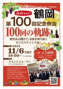 第100回記念例会開催日 令和7年 11月 6日(木) 受付 17:30 開会 18:00 会場 グランドエル・サン 会費 7,000円 (ブースチケット 1,000円込み) ![]() |